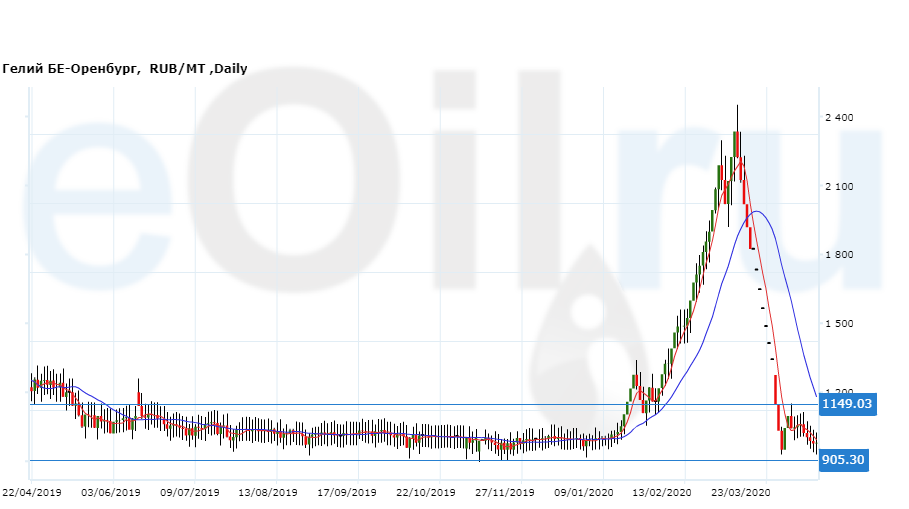Цены на гелий газообразный, базис поставки Оренбургская область, упали за неделю на 81 рубль до 980 рублей за кубический метр.