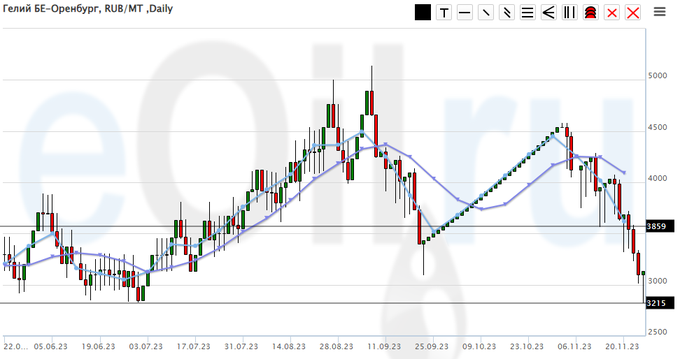 Цены на гелий газообразный, базис поставки Оренбургская область, не изменились за неделю, и составляют 4229 рублей за кубический метр.