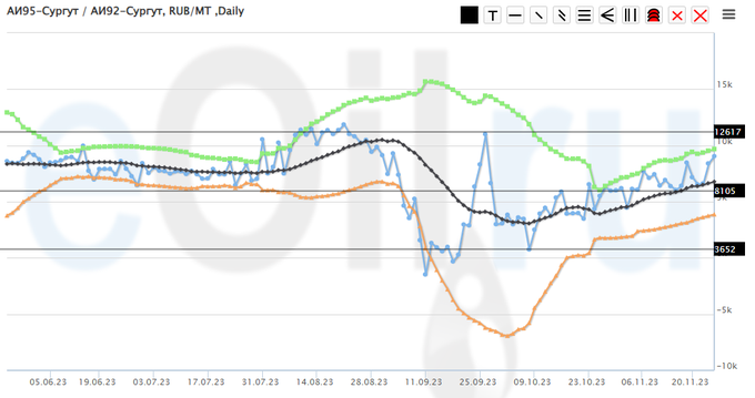 Разница цен между 95-м и 92-м бензином на базисе Сургут (Ханты-Мансийский а.о.).