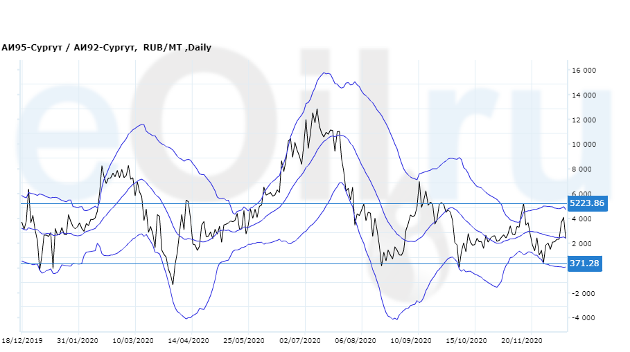 Разница цен между 95-м и 92-м бензином на базисе Сургут (Ханты-Мансийский а.о.).
