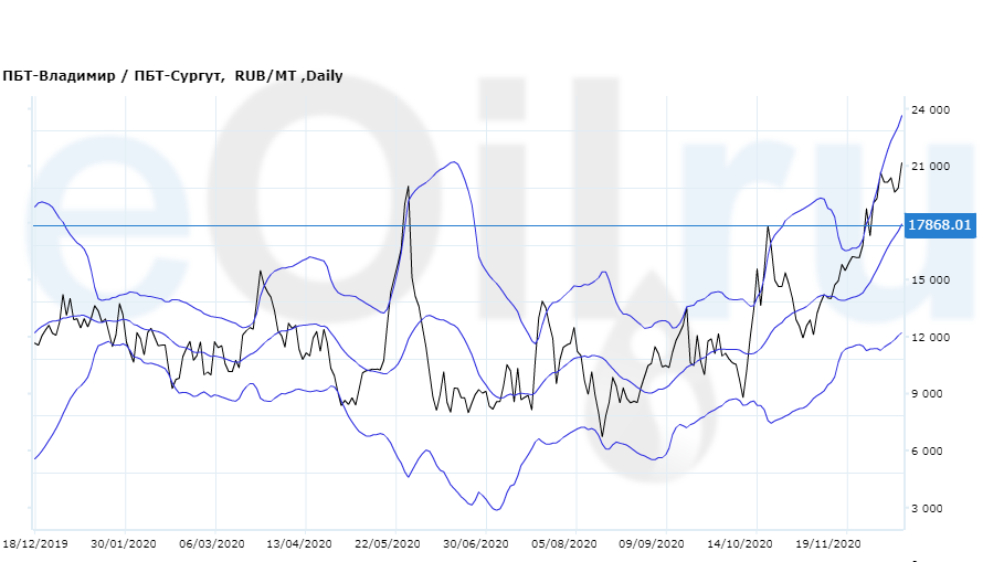 Разница цен между ПБТ на базисе Владимир и ПБТ на базисе Сургут (Ханты-Мансийский а.о.).