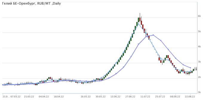 Цены на гелий газообразный, базис поставки Оренбургская область, выросли за неделю на 185 рублей до 2600 рублей за кубический метр.