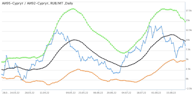 Разница цен между 95-м и 92-м бензином на базисе Сургут (Ханты-Мансийский а.о.).