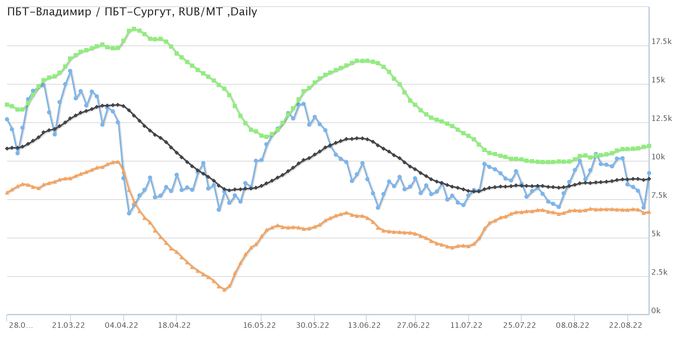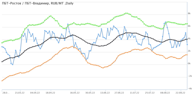 Разница цен между ПБТ на базисе Ростов и ПБТ на базисе Владимир.