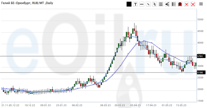 Цены на гелий газообразный, базис поставки Оренбургская область, снизились за неделю на 98 рублей до 3203 рублей за кубический метр.