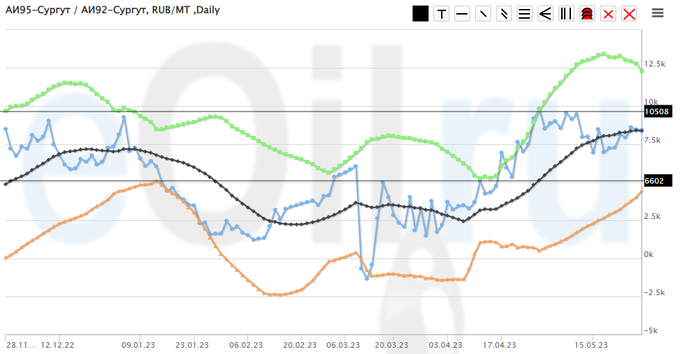 Разница цен между 95-м и 92-м бензином на базисе Сургут (Ханты-Мансийский а.о.).
