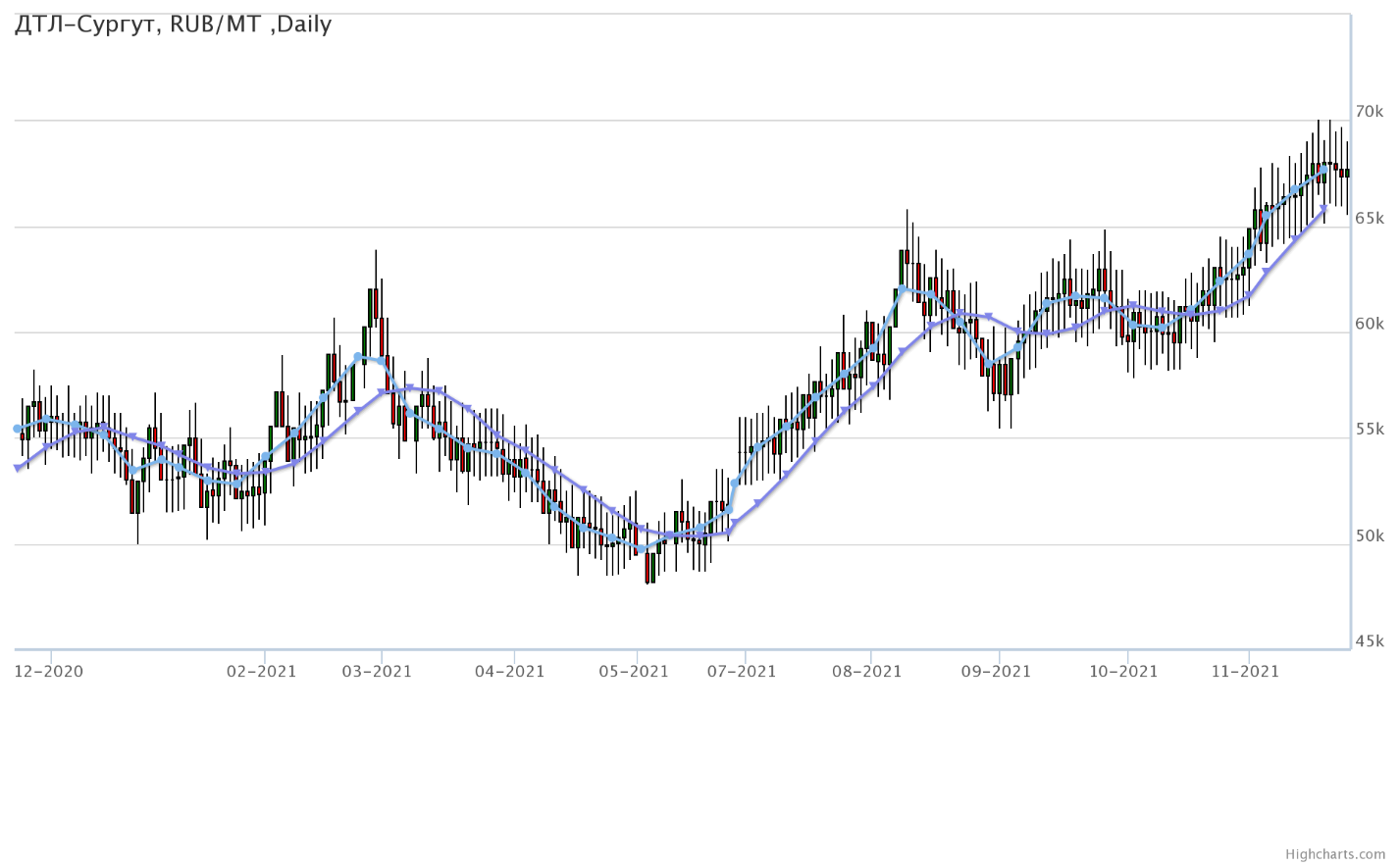 Цены на топливо дизельное ДТ-А-К5, базис поставки Ханты-Мансийский АО, выросли за неделю на 607 рублей до 67722 рублей за тонну.