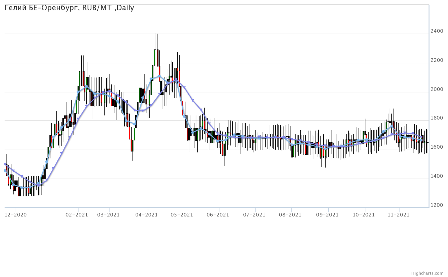 Цены на гелий газообразный, базис поставки Оренбургская область, снизились за неделю на 9 рублей до 1653 рублей за кубический метр.