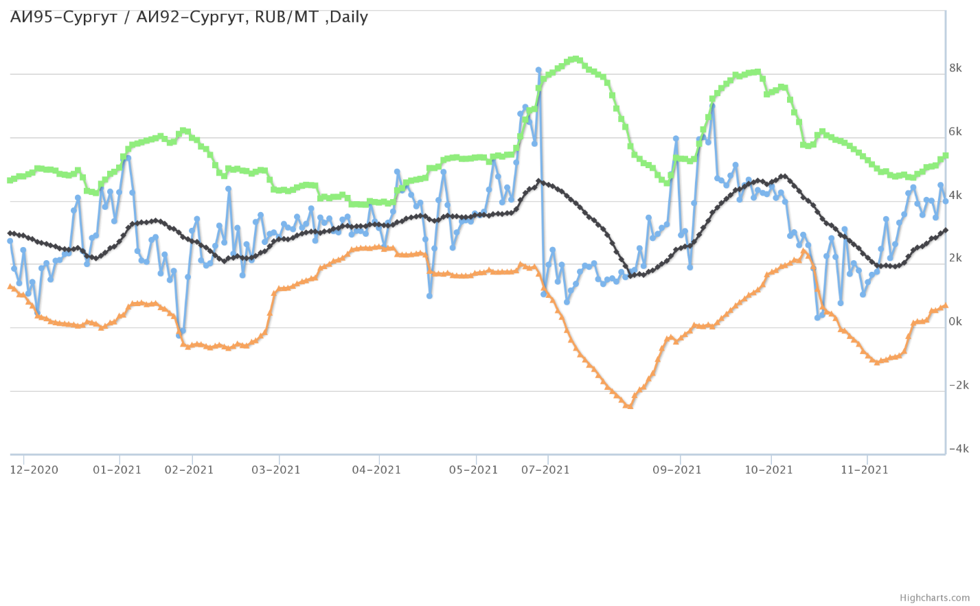 Разница цен между 95-м и 92-м бензином на базисе Сургут (Ханты-Мансийский а.о.).