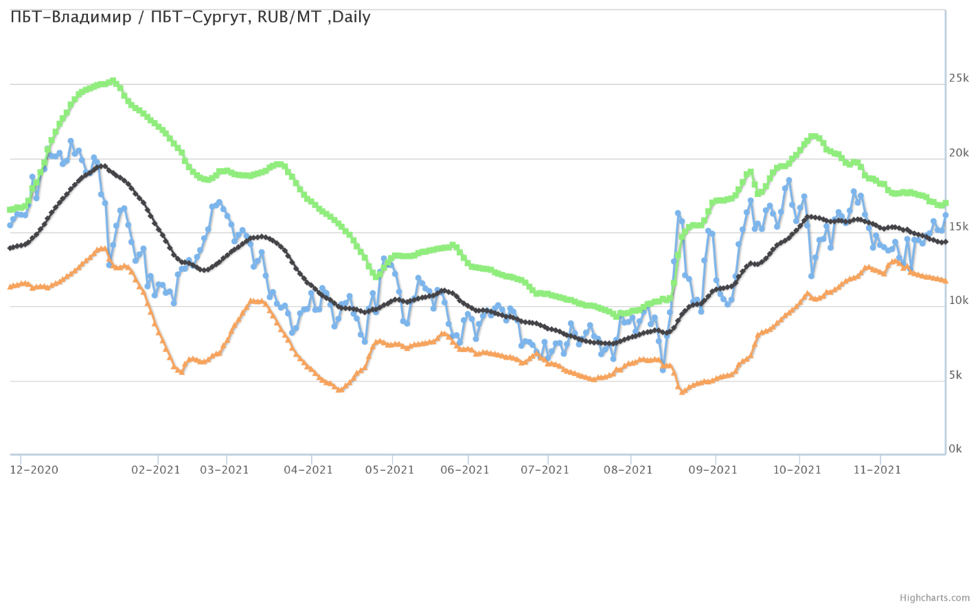 Разница цен между ПБТ на базисе Владимир и ПБТ на базисе Сургут (Ханты-Мансийский а.о.).