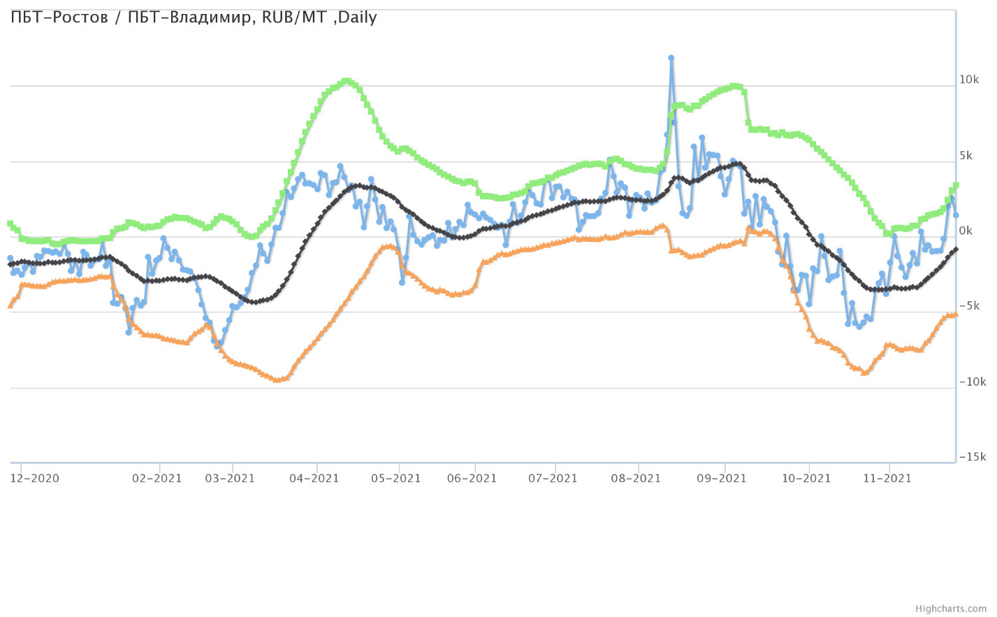 Разница цен между ПБТ на базисе Ростов и ПБТ на базисе Владимир.