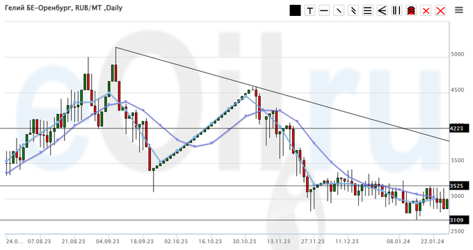 Цены на гелий газообразный, базис поставки Оренбургская область, снизились за неделю на 13 рубля до 2991 рубля за кубический метр.