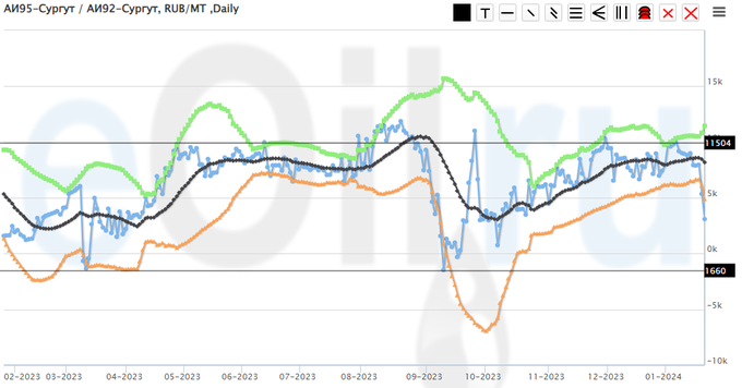 Разница цен между 95-м и 92-м бензином на базисе Сургут (Ханты-Мансийский а.о.).