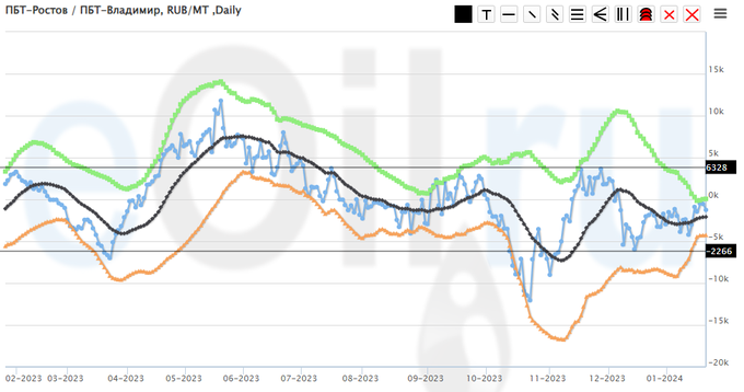Разница цен между ПБТ на базисе Ростов и ПБТ на базисе Владимир.