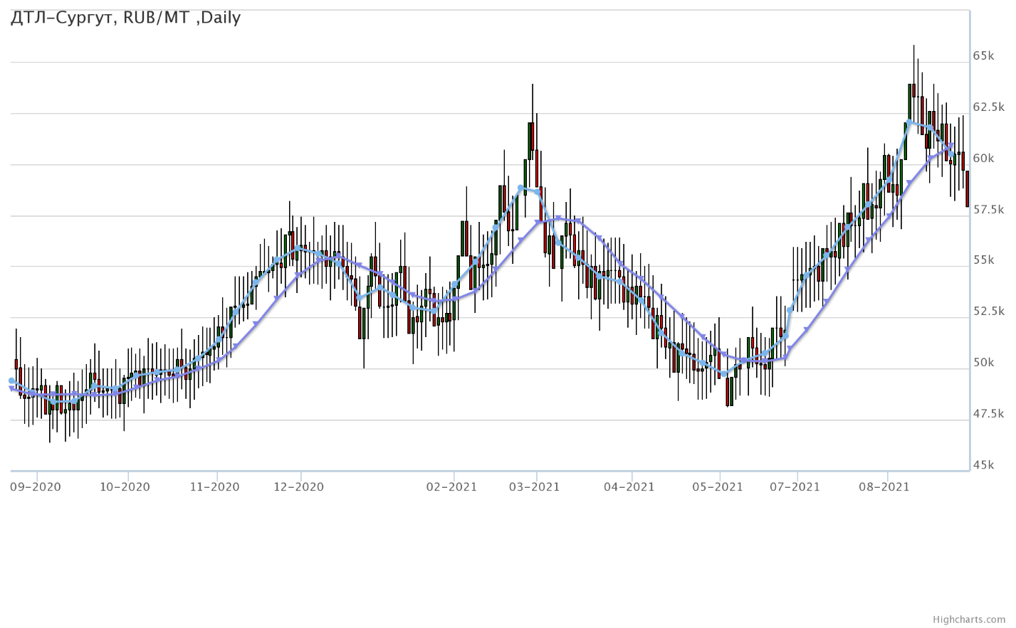 Цены на топливо дизельное ДТ-А-К5, базис поставки Ханты-Мансийский АО, снизились за неделю на 2254 рубля до 57950 рублей за тонну.