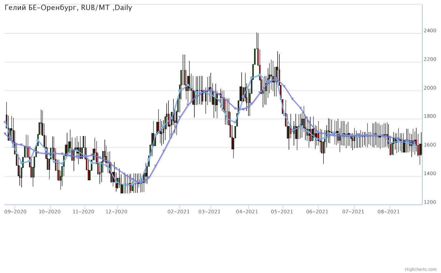 Цены на гелий газообразный, базис поставки Оренбургская область, снизились за неделю на 75 рублей до 1555 рублей за кубический метр.