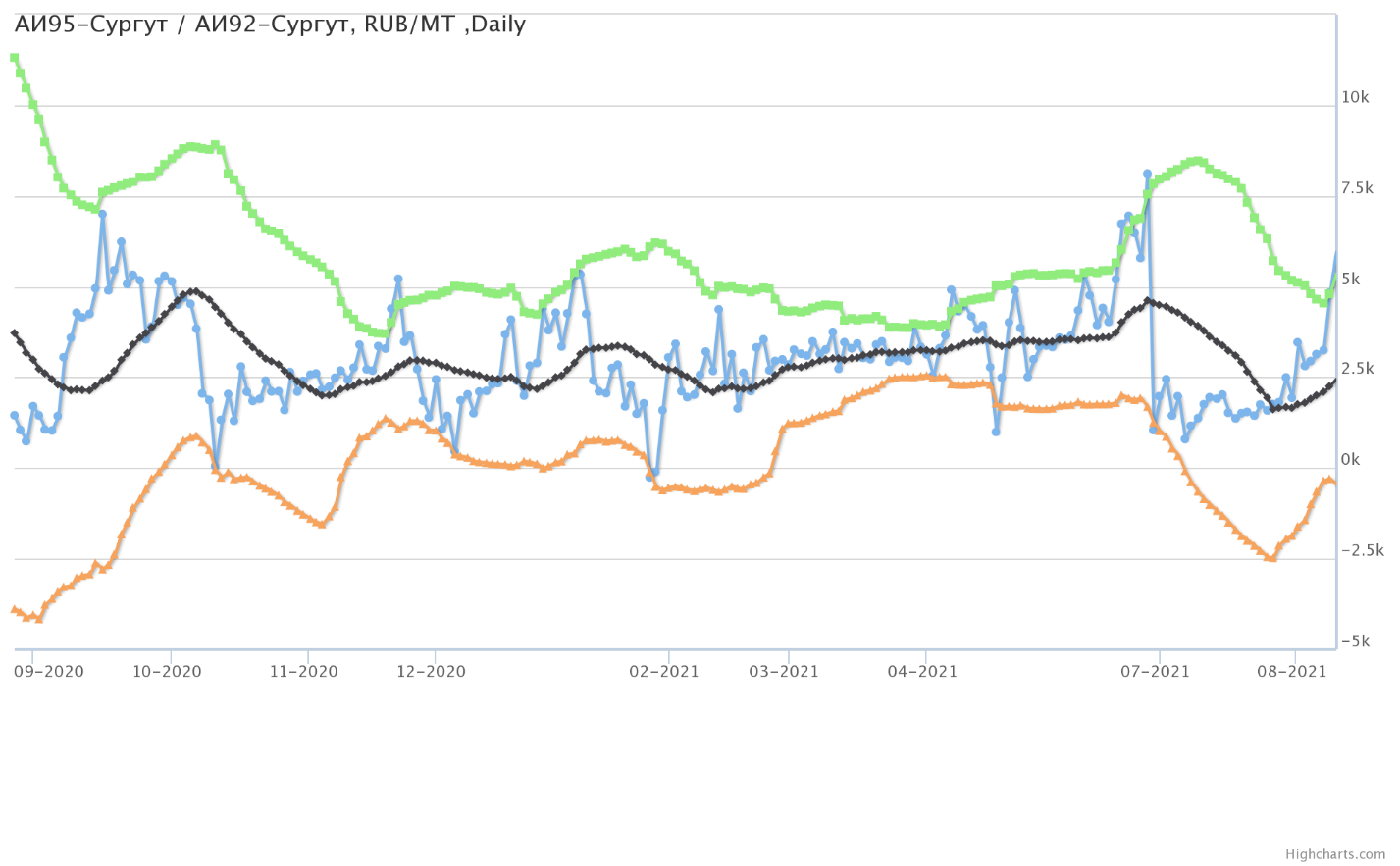 Разница цен между 95-м и 92-м бензином на базисе Сургут (Ханты-Мансийский а.о.).