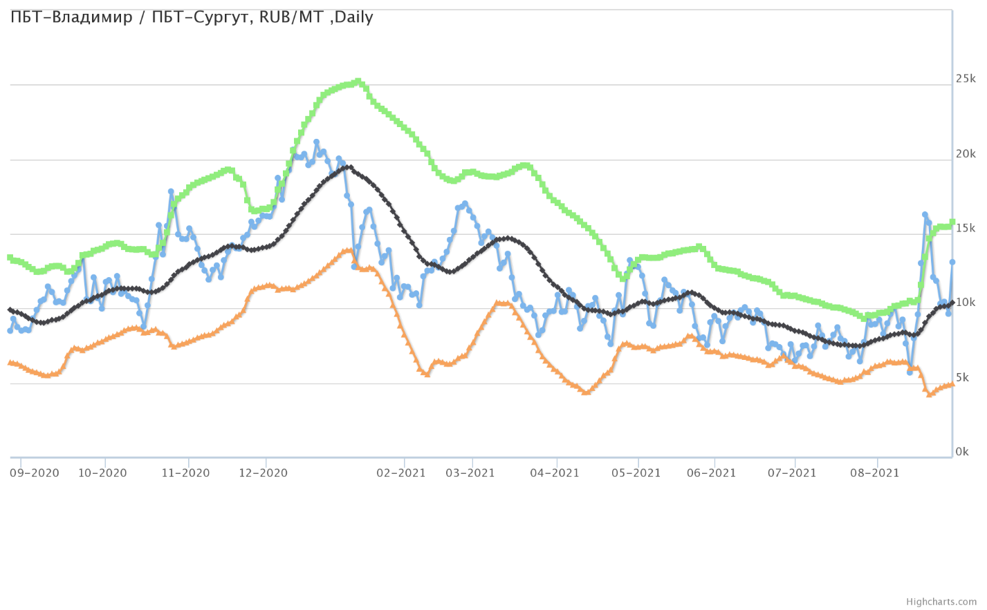 Разница цен между ПБТ на базисе Владимир и ПБТ на базисе Сургут (Ханты-Мансийский а.о.).