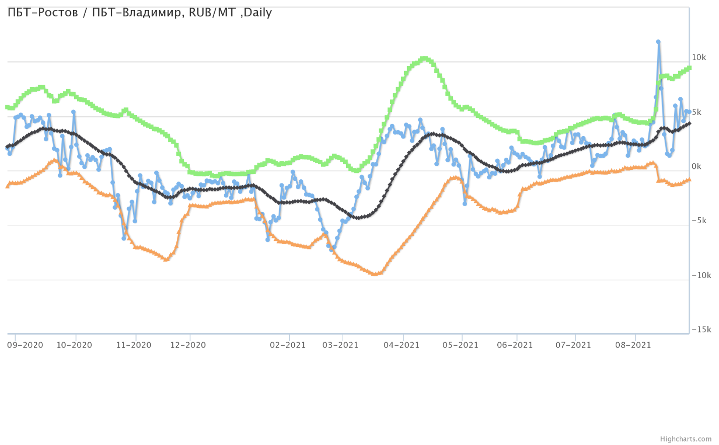 Разница цен между ПБТ на базисе Ростов и ПБТ на базисе Владимир.