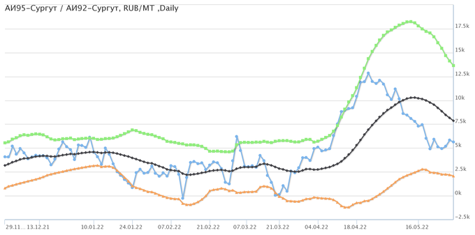 Разница цен между 95-м и 92-м бензином на базисе Сургут (Ханты-Мансийский а.о.).