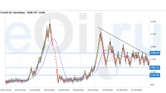 Цены на гелий газообразный, базис поставки Оренбургская область, упали за неделю на 138 рублей до 1358 рублей за кубический метр.