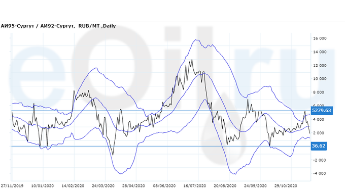 Разница цен между 95-м и 92-м бензином на базисе Сургут (Ханты-Мансийский а.о.).