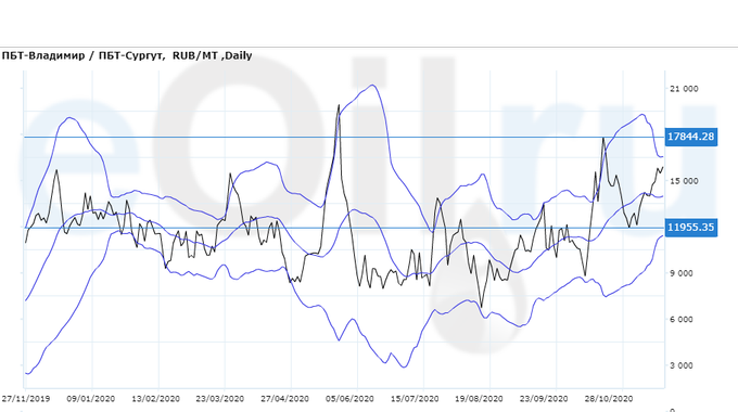 Разница цен между ПБТ на базисе Владимир и ПБТ на базисе Сургут (Ханты-Мансийский а.о.).
