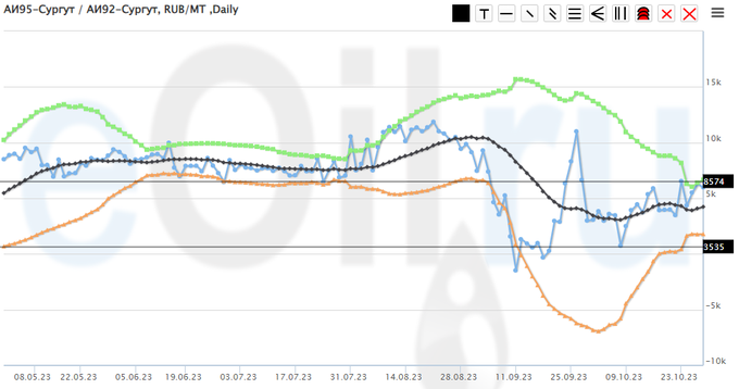 Разница цен между 95-м и 92-м бензином на базисе Сургут (Ханты-Мансийский а.о.).