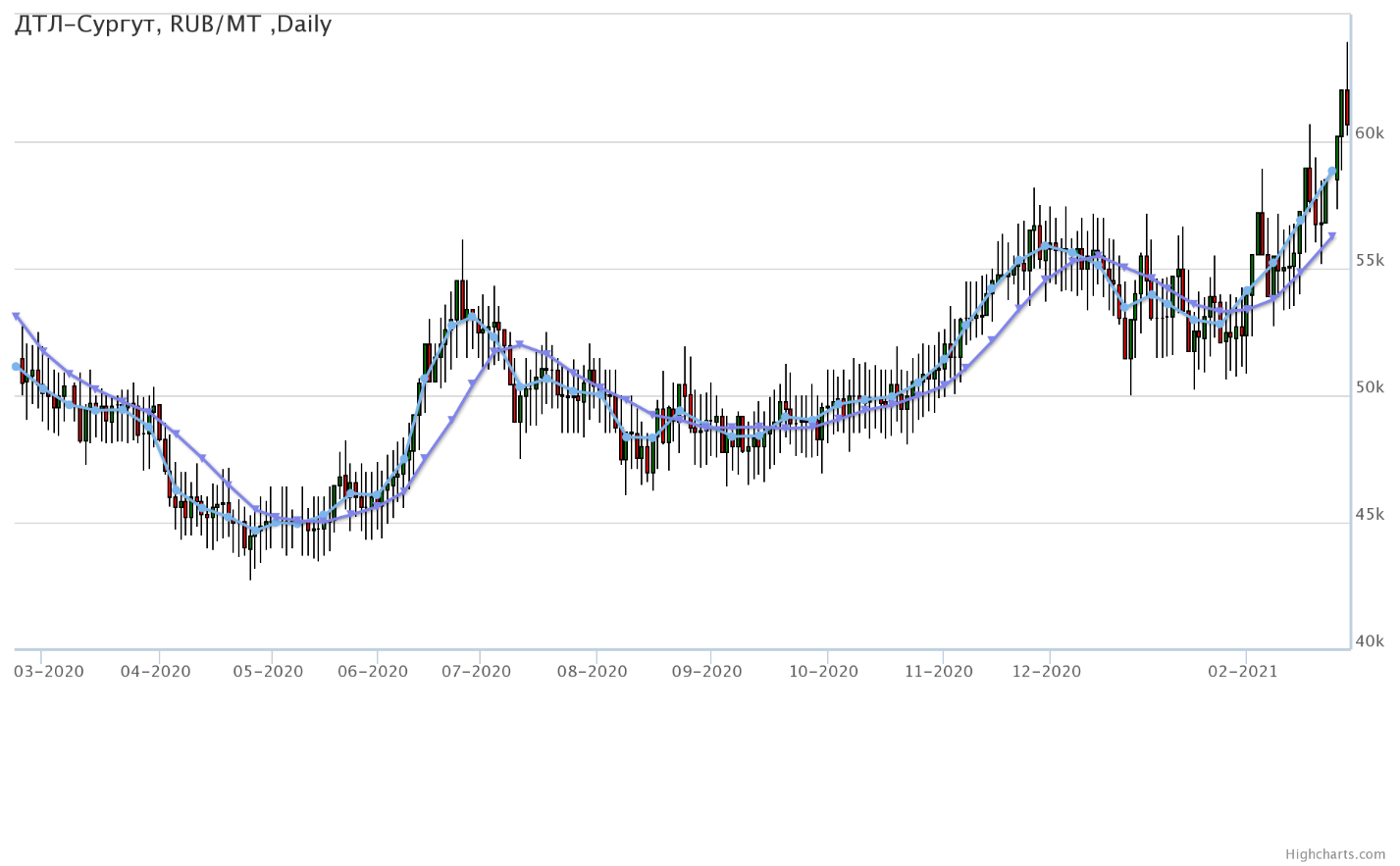 Цены на топливо дизельное ДТ-А-К5, базис поставки Ханты-Мансийский а.о., выросли за неделю на 2200 рублей до 60700 рублей за тонну.