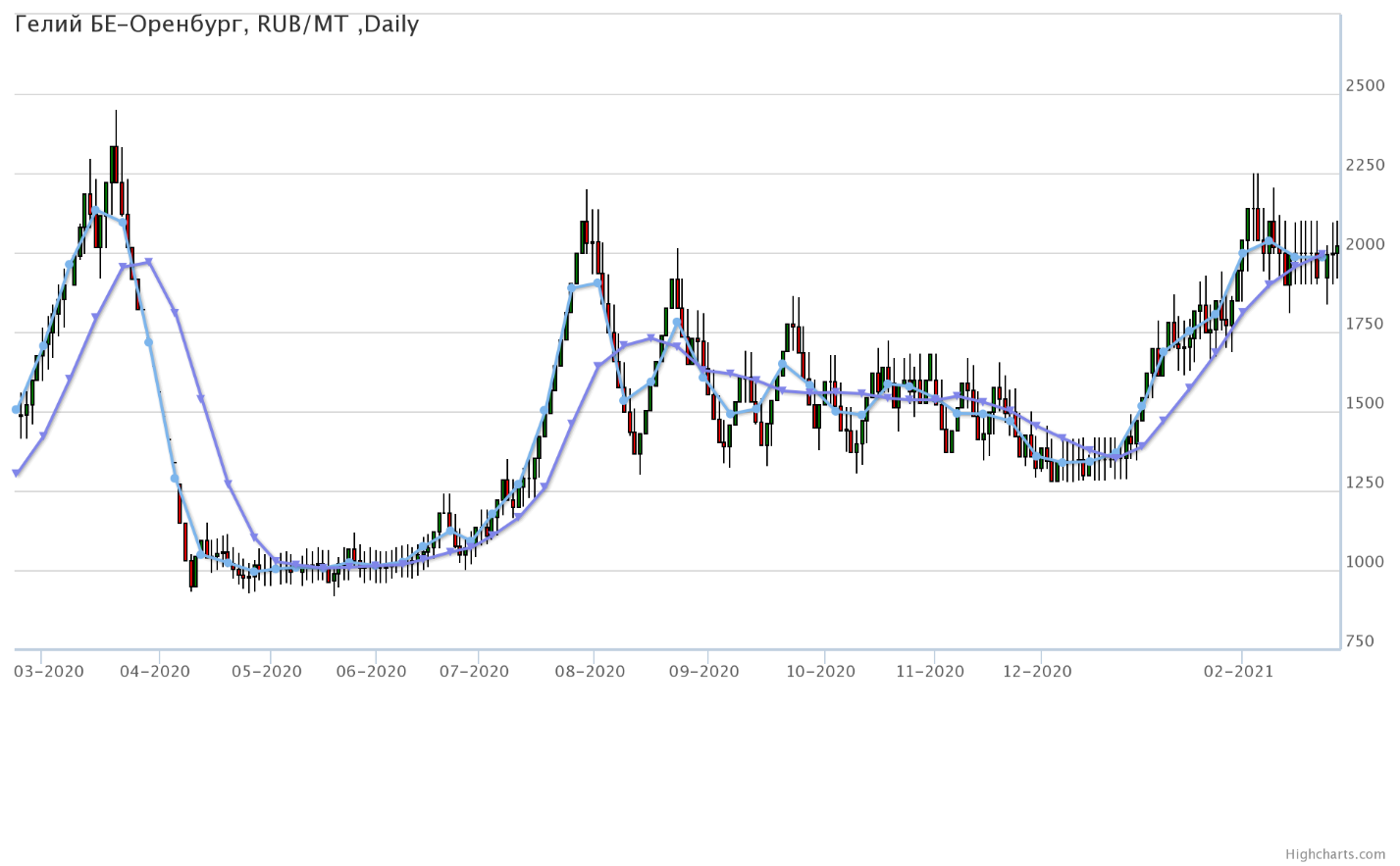 Цены на гелий газообразный, базис поставки Оренбургская область, выросли за неделю на 96 рублей до 2021 рубля за кубический метр.