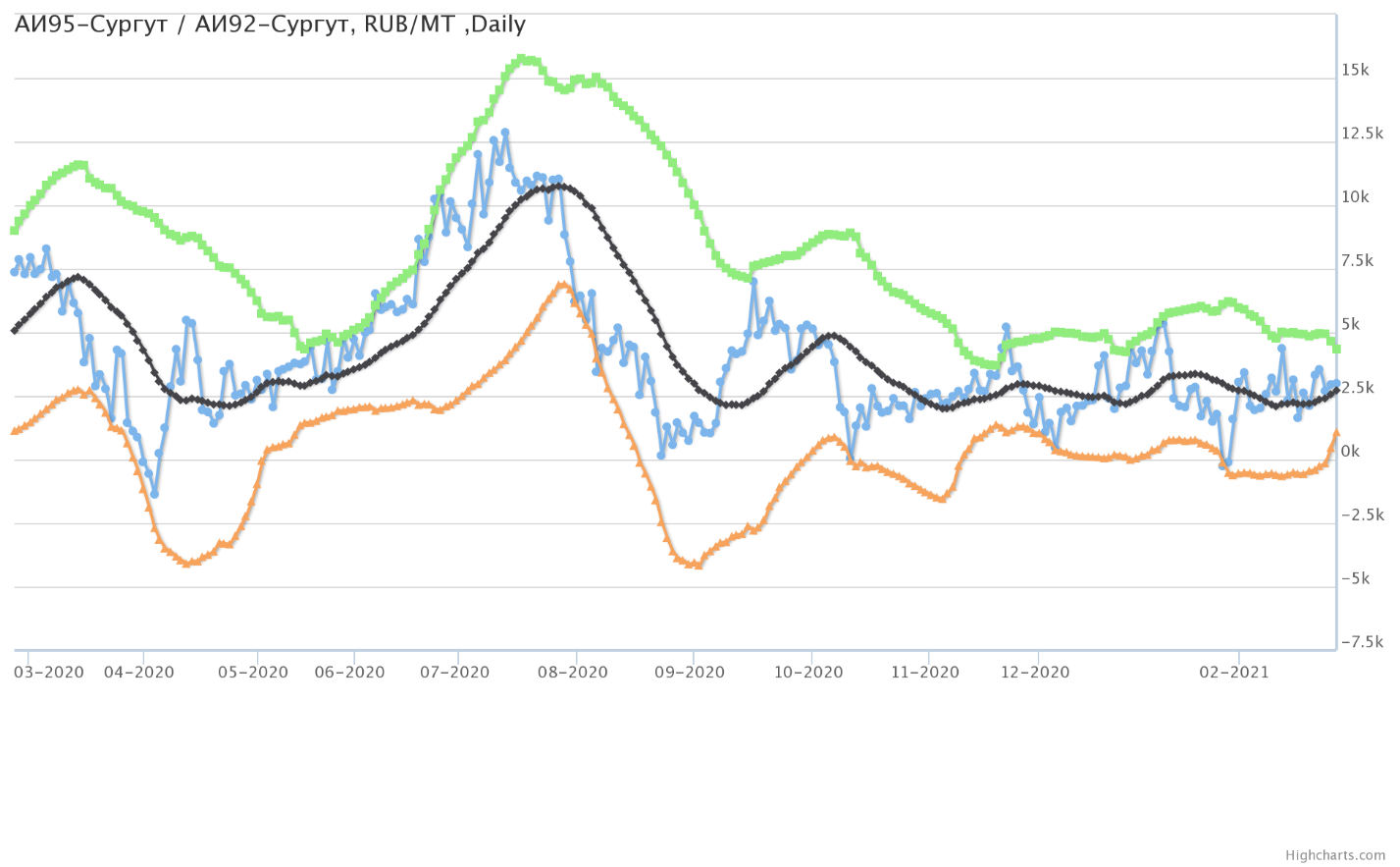 Разница цен между 95-м и 92-м бензином на базисе Сургут (Ханты-Мансийский а.о.).