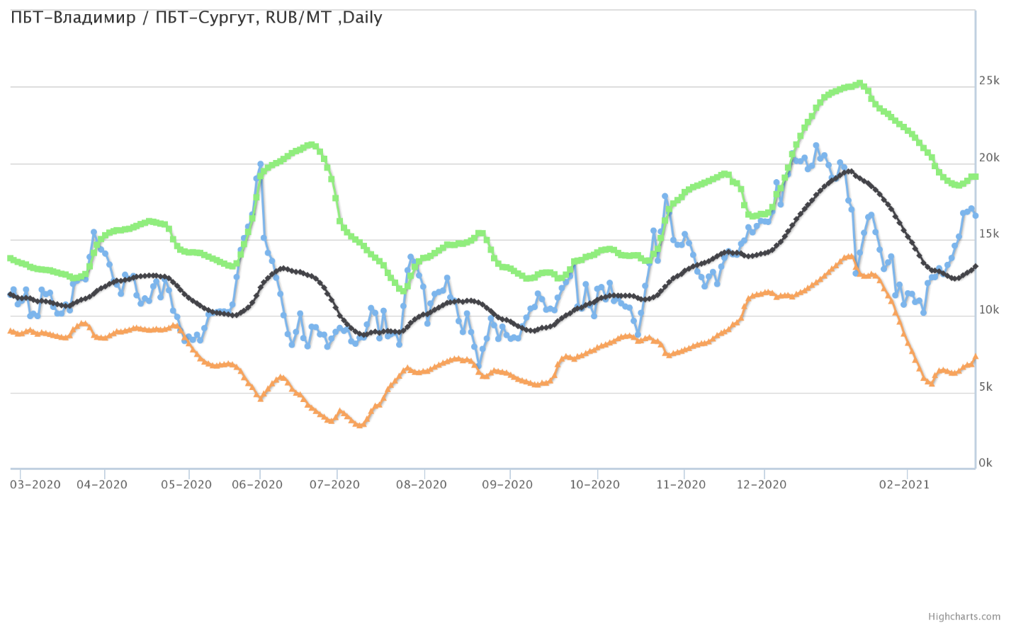 Разница цен между ПБТ на базисе Владимир и ПБТ на базисе Сургут (Ханты-Мансийский а.о.).