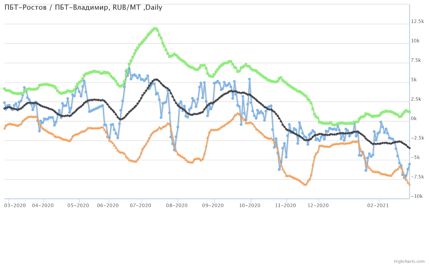 Разница цен между ПБТ на базисе Ростов и ПБТ на базисе Владимир.