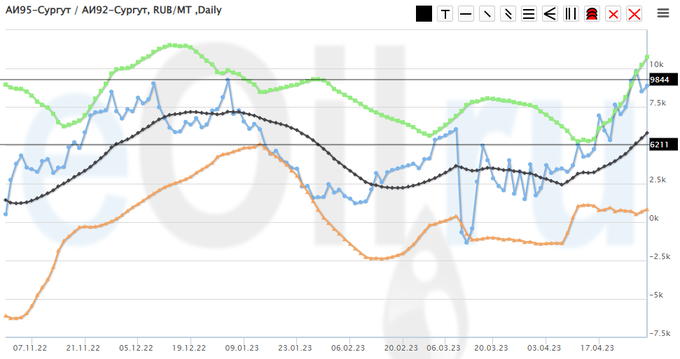 Разница цен между 95-м и 92-м бензином на базисе Сургут (Ханты-Мансийский а.о.).