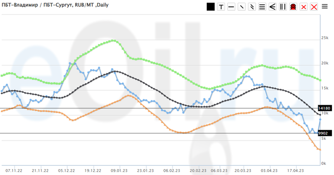 Разница цен между ПБТ на базисе Владимир и ПБТ на базисе Сургут (Ханты-Мансийский а.о.).
