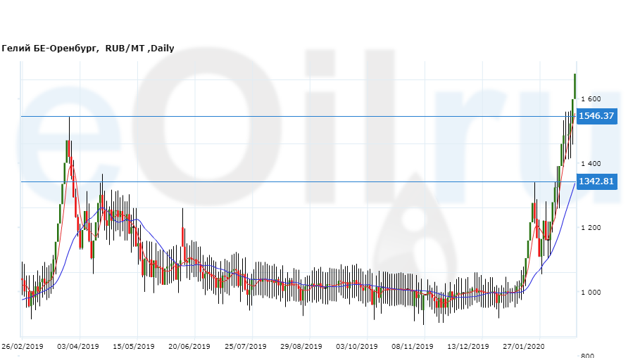 Цены на гелий газообразный, базис поставки Оренбургская область, выросли за неделю на 192 рубля до 1678 рублей за тонну.