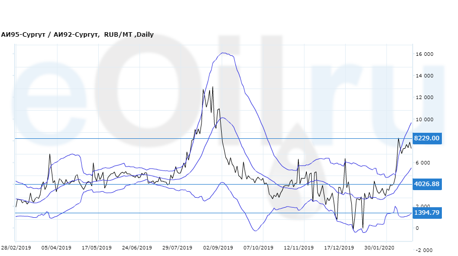 Разница цен между 95-м и 92-м бензином на базисе Сургут (Ханты-Мансийский а.о.).