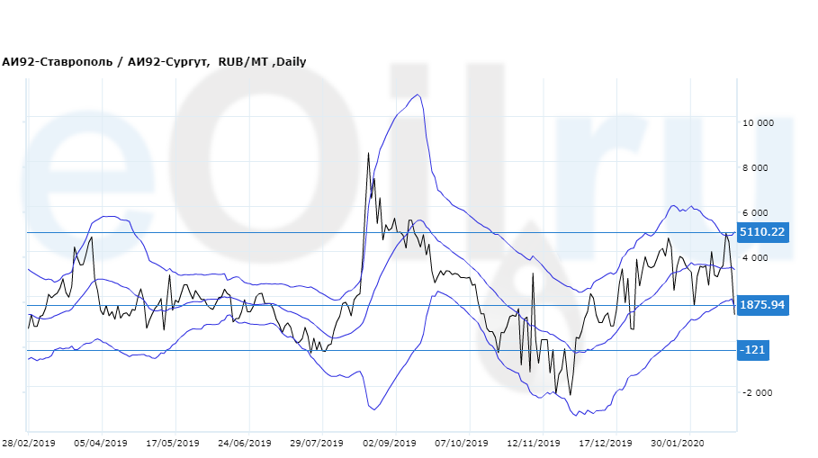 Разница цен между 92-м бензином на базисе Ставрополь и 92-м бензином на базисе Сургут (Ханты-Мансийский а.о.).