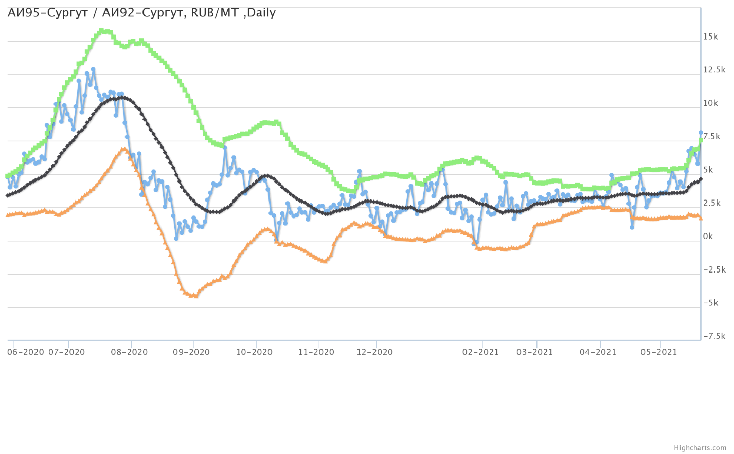 Разница цен между 95-м и 92-м бензином на базисе Сургут (Ханты-Мансийский а.о.).
