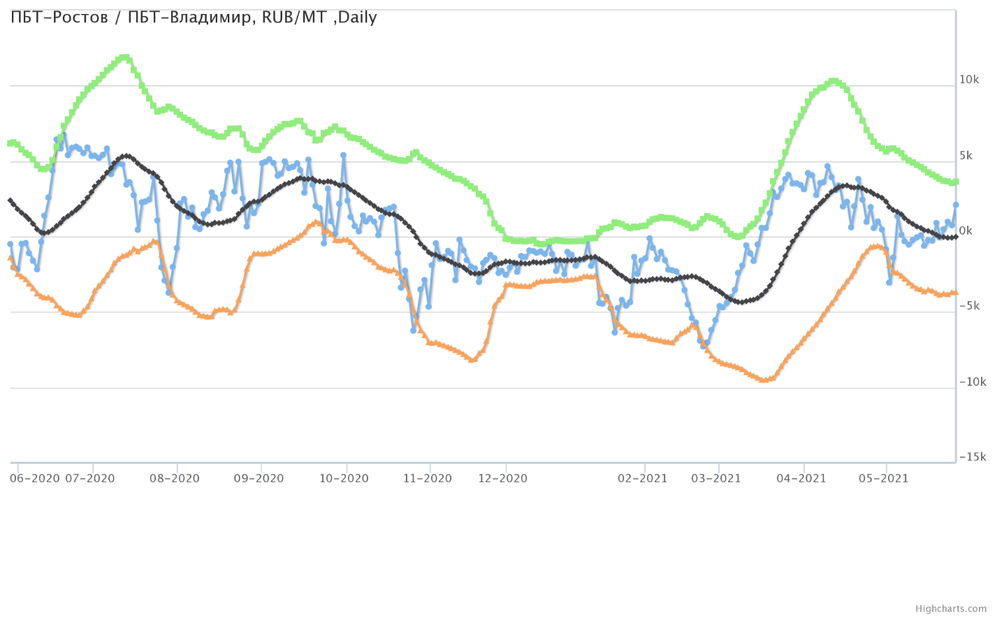 Разница цен между ПБТ на базисе Ростов и ПБТ на базисе Владимир.
