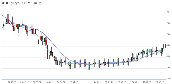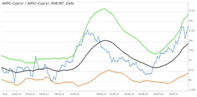 Разница цен между 95-м и 92-м бензином на базисе Сургут (Ханты-Мансийский а.о.).