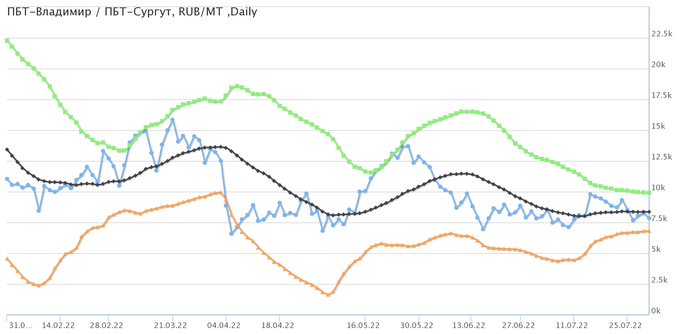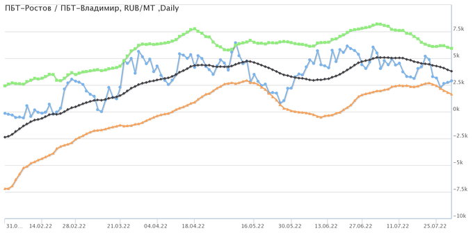 Разница цен между ПБТ на базисе Ростов и ПБТ на базисе Владимир.
