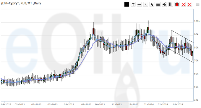 Цены на топливо дизельное ДТ-А-К5, базис поставки Ханты-Мансийский АО, снизились за неделю на 3017 рублей до 76550 рублей за тонну.
