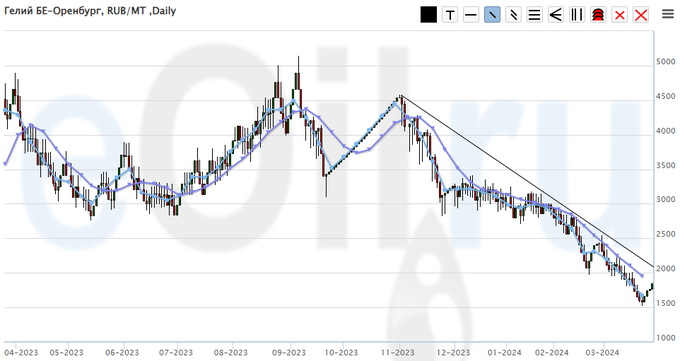 Цены на гелий газообразный, базис поставки Оренбургская область, выросли за неделю на 249 рублей до 1853 рублей за кубический метр.