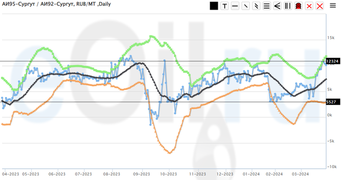 Разница цен между 95-м и 92-м бензином на базисе Сургут (Ханты-Мансийский а.о.).