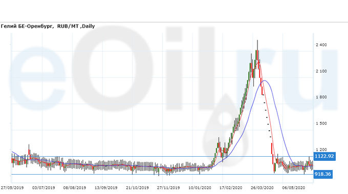 Цены на гелий газообразный, базис поставки Оренбургская область, упали за неделю на 4 рубля до 1012 рублей за кубический метр.