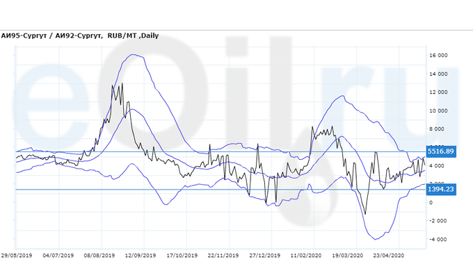 Разница цен между 95-м и 92-м бензином на базисе Сургут (Ханты-Мансийский а.о.).