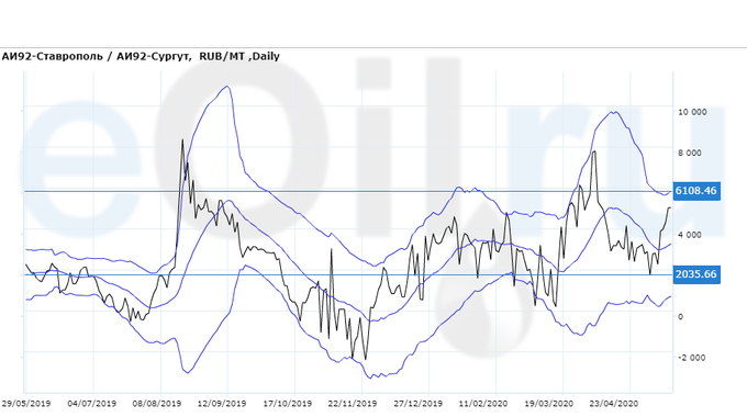 Разница цен между 92-м бензином на базисе Ставрополь и 92-м бензином на базисе Сургут (Ханты-Мансийский а.о.).