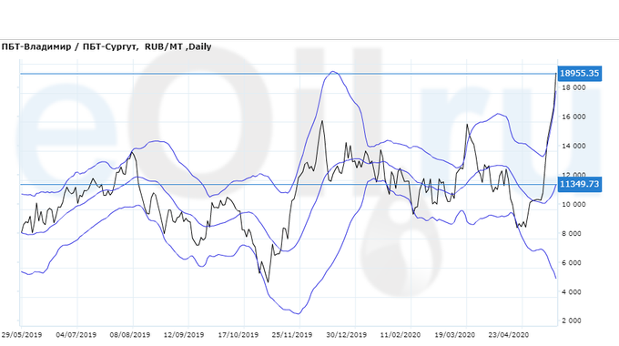 Разница цен между ПБТ на базисе Владимир и ПБТ на базисе Сургут (Ханты-Мансийский а.о.).