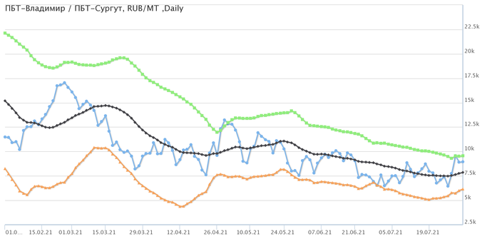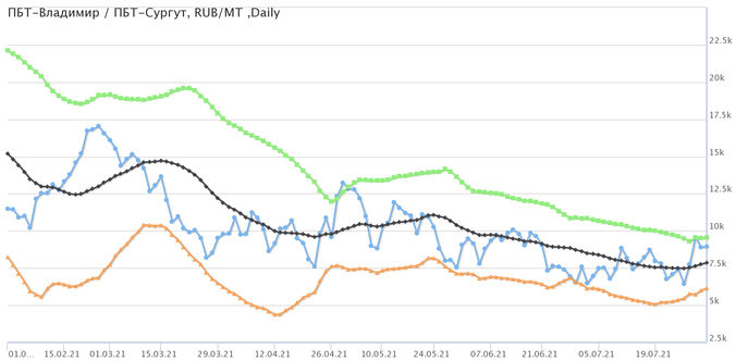 Разница цен между ПБТ на базисе Владимир и ПБТ на базисе Сургут (Ханты-Мансийский а.о.).